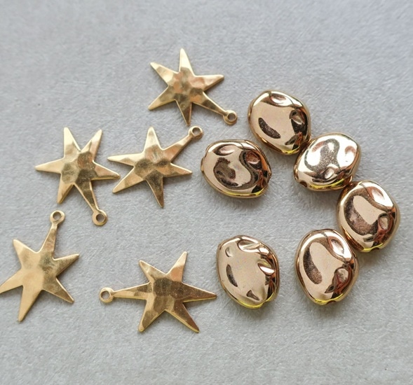チャームタイプはそのままアクセサリーに使え、穴なし・カンなしのスタンピングパーツは接着や加工して使ってください。