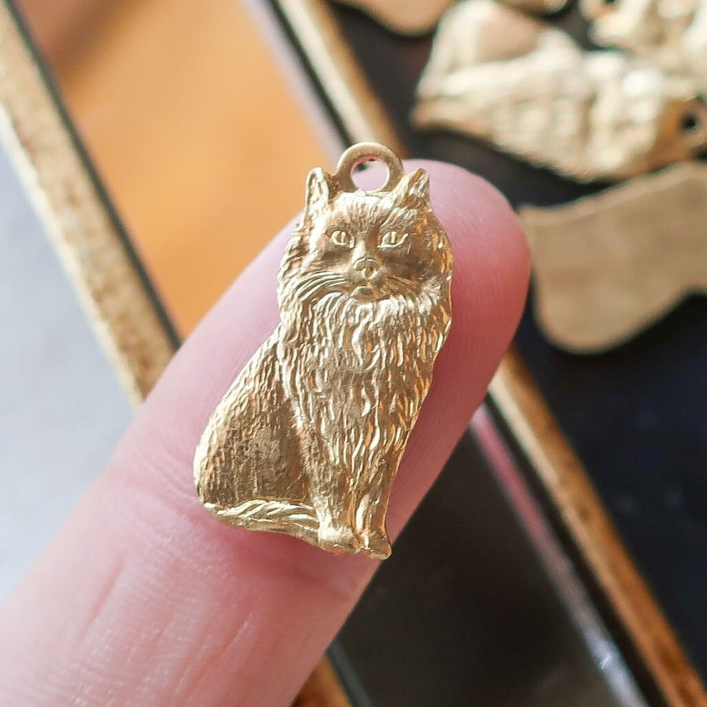 ・猫の毛並みや表情まで細かく型押しされた、存在感のあるチャームです